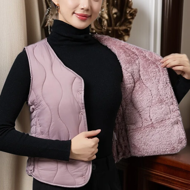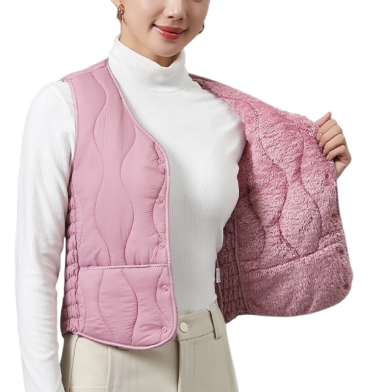 ● 부드럽고 따뜻한 기모 소재로 제작되어 한겨울에도 포근하게 착용할 수 있는 여성용 슬림핏 숏 베스트입니다.